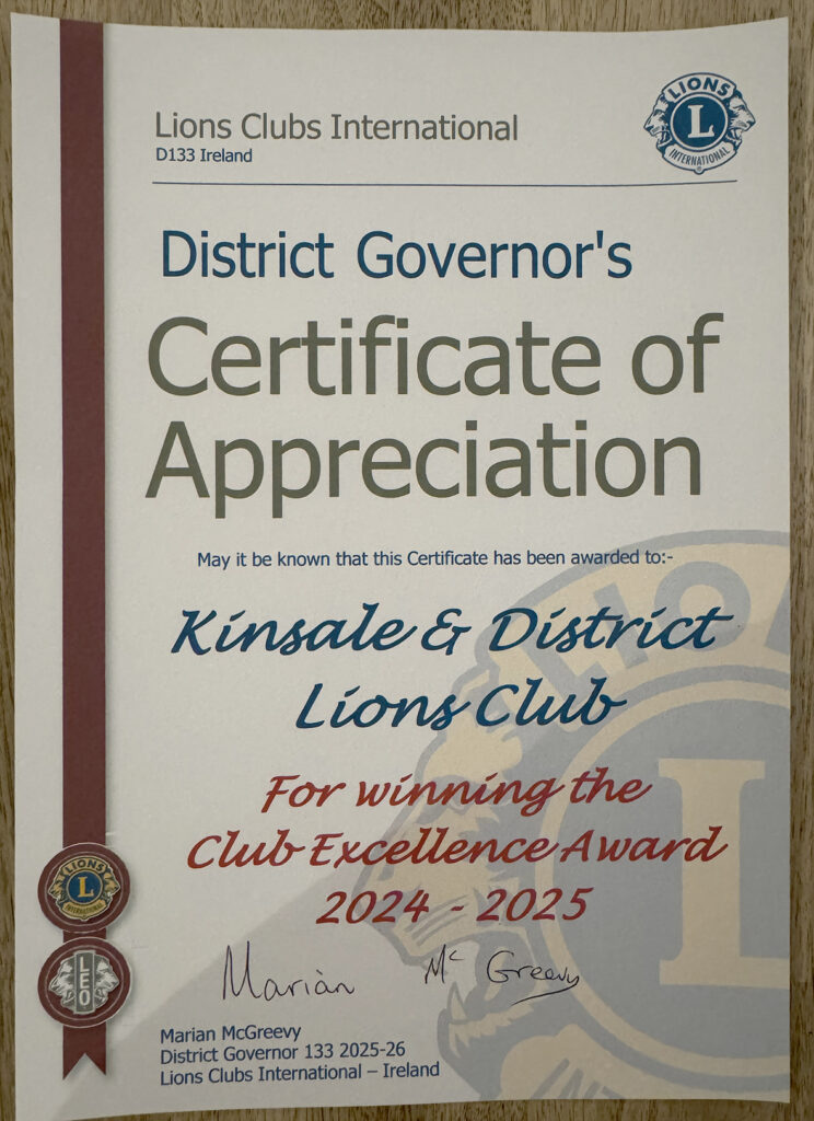 Kinsale & District Lions Club is delighted to announce that it has been awarded the Lions Clubs International Club Excellence Award for the 2024/2025 year, one of the highest honours a Lions club can receive. The award was formally presented by District Governor Marian McGreevey, to club President Cormac Fitzgerald recognising the club’s outstanding achievements in leadership, membership growth, impactful community service, and humanitarian contribution. The Club Excellence Award celebrates Lions clubs that demonstrate exceptional commitment to service and strong governance, and that deliver measurable, positive impact within their communities. It also reflects adherence to the core values and standards of Lions Clubs International.