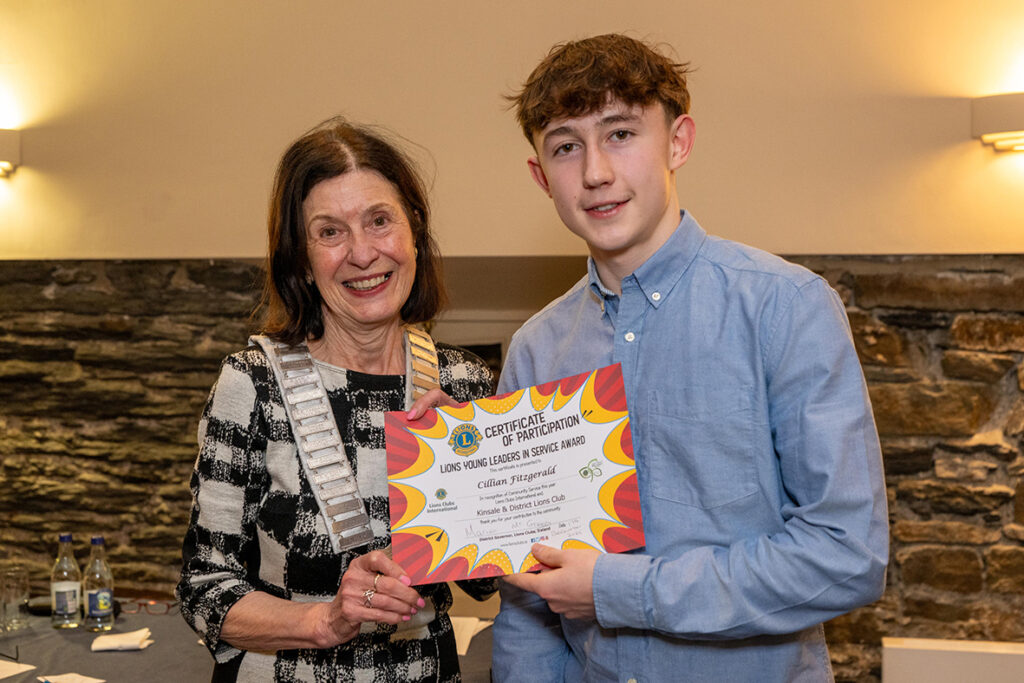 District Governor Marian McGreevey, whose theme is ‘We Serve Together’, praised the club for its leadership and community engagement, noting that Kinsale & District Lions Club exemplifies the collaborative spirit and service ethos of Lionism. Kinsale & District Lions Club has delivered a wide range of initiatives throughout the year, including major community fundraising events, health and wellbeing supports, senior citizen initiatives, food and toy appeals, and collaborative projects with hospitals, charities, volunteers, and emergency services across Cork. The district governor presented Cillian Fitzgerald of Kinsale Community School with a lion’s young leaders in service award for his volunteerism.